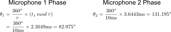 A simple approach to calculating the amplitude of the combined microphone signals (the array's output) is to use phasors. The figure below shows how the phase difference between two signals is calculated. One period of a wave corresponds to 360°, given a period of 10ms, a delay of 2.305ms corresponds to a phase shift of 82.975°.