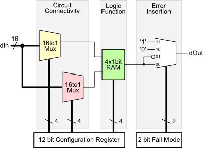 The cell and cell array designs used in this lab have been modified from those used in Lab 1. The cell circuit is shown below. The main differences from the previous design are the reduction in size of the LUT and the inclusion of a failure injection multiplexer. The choice of failure mode is set by the 2-bit Fail Mode register. The different failure modes are described in the table below.