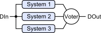Triple Modular Redundancy (TMR) is static redundancy architecture. It provides a method for masking faults in a system. The left-hand figure below shows the TMR architecture. Three functionally identical units are used in parallel. A voter unit is used to generate a single output that is a majority vote of the three system outputs. Therefore, if a single unit fails, the two others will out vote it, and the voter output remains correct. The right-hand figure shows the circuit for a voter.